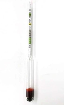 A Hydrometer Measures the density or specific gravity of a liquid. Used to give a reading to the gravity of your wort.